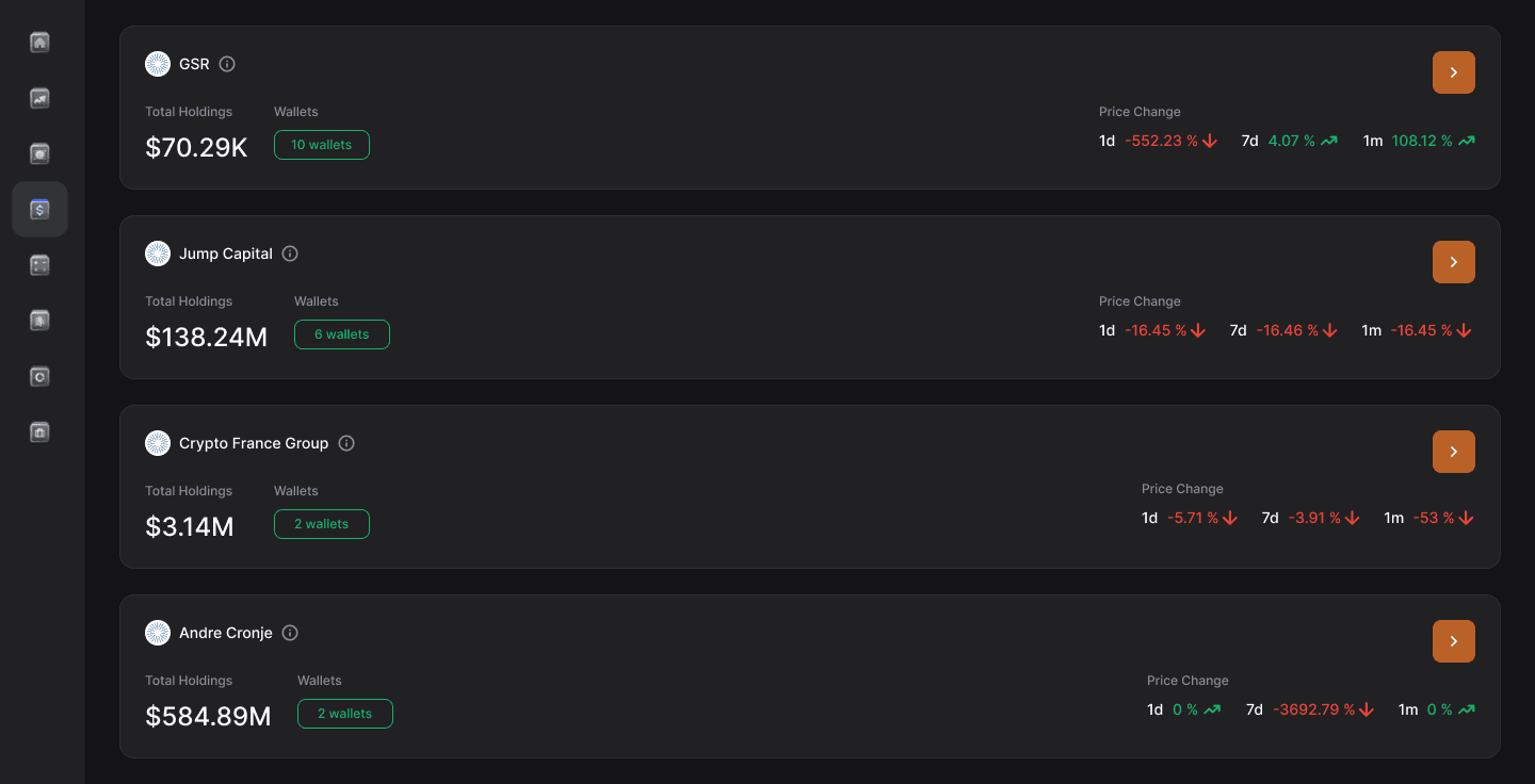 Fund Wallet view tracks capital movement across known institutional wallets — helping users front-run large shifts in positioning.