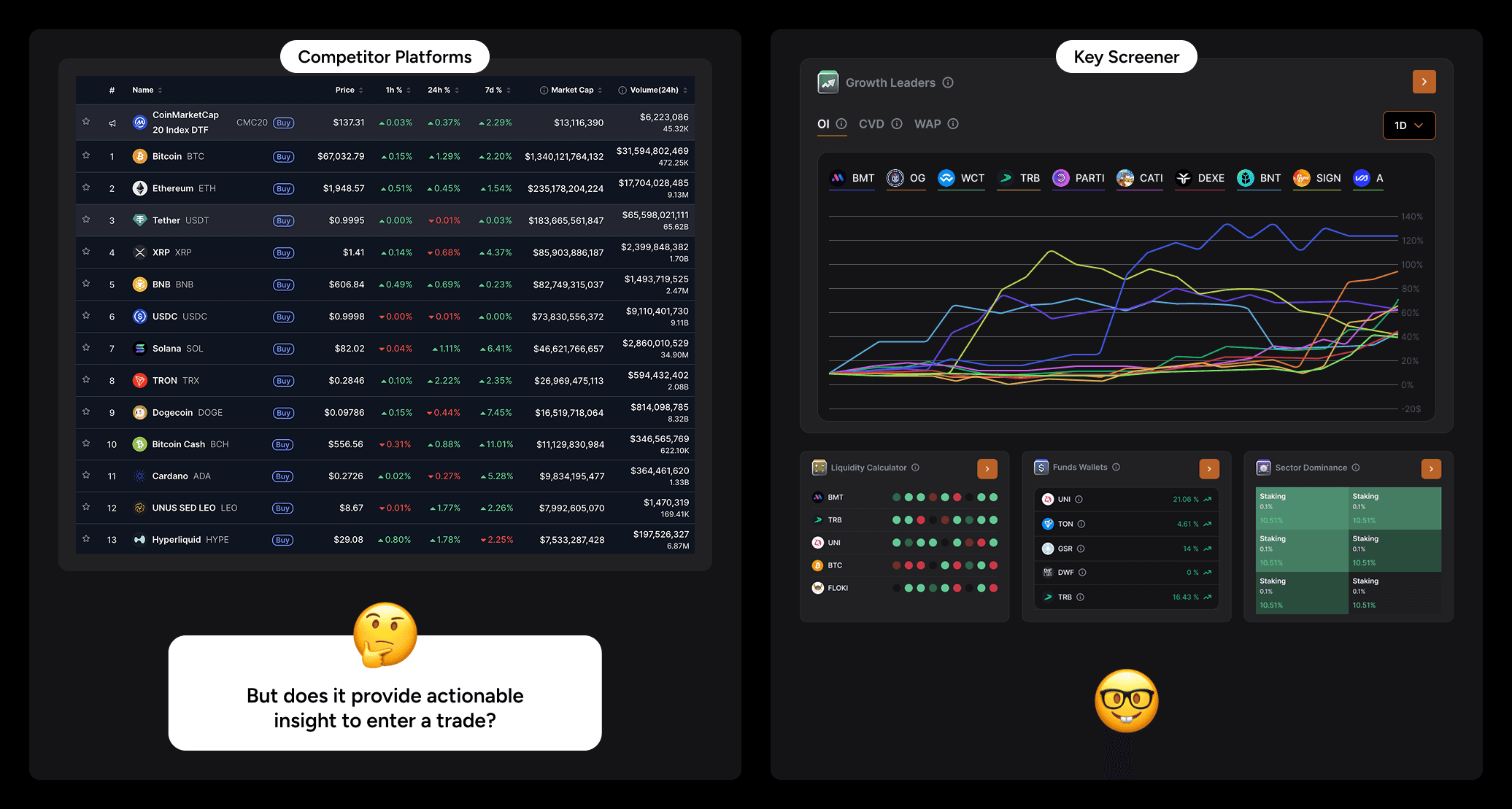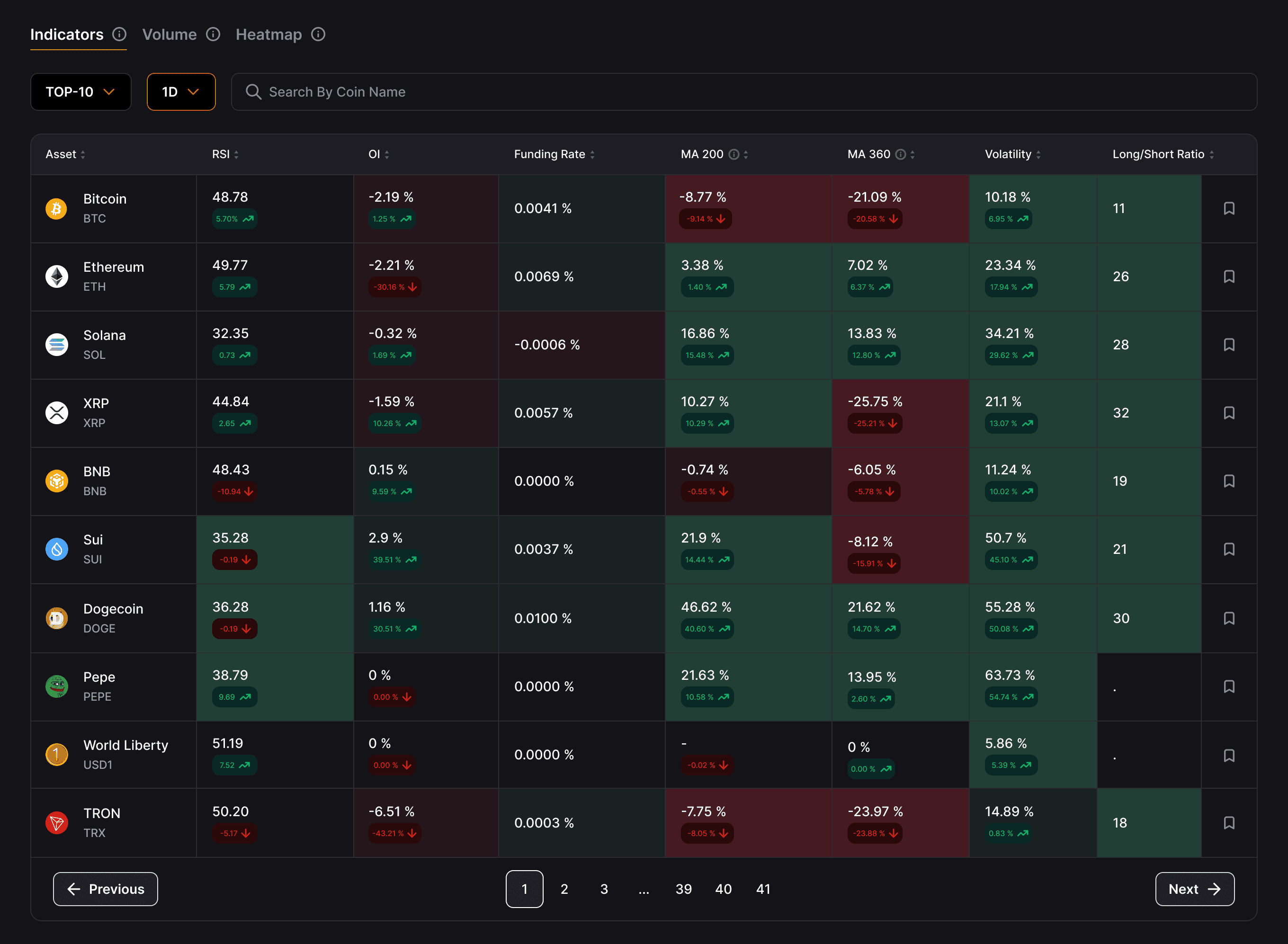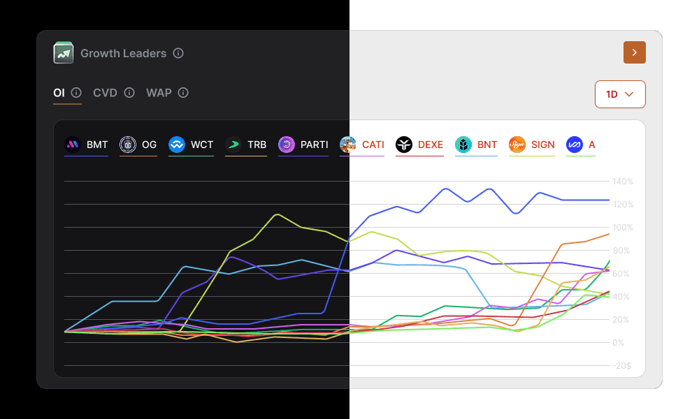 Monitor funding, volume, dominance, sentiment, and momentum in a unified interface.